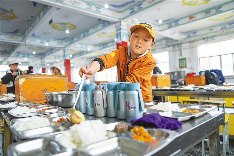 圖為那曲市班戈縣中石化小學學生在為同學們分發(fā)午餐(6月22日攝)。新華社記者 丁增尼達 攝