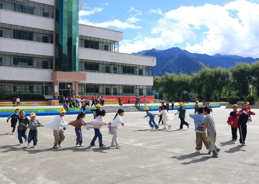 課間十分鐘,孩子們?cè)陉?yáng)光下做游戲。新華社記者 沈曉朦 攝
