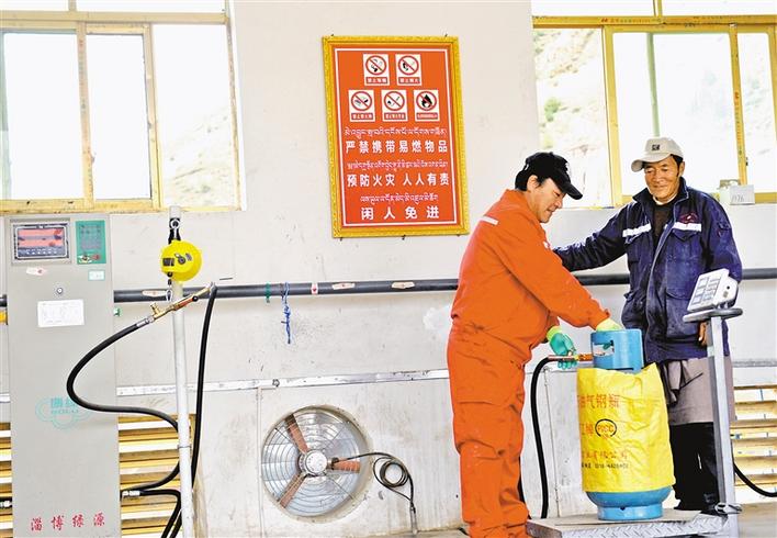 比如縣江然村長(zhǎng)廊液化加氣站,61歲的致富帶頭人貢覺才培(左一),正在熟練地和工人給煤氣罐加氣。