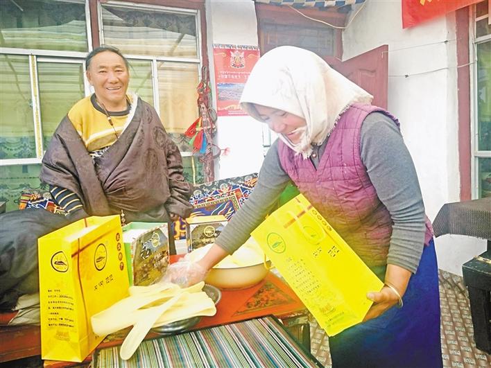 全區(qū)第一個(gè)家庭牧場(chǎng)、班戈縣尼瑪鄉(xiāng)吾前村家庭牧場(chǎng)主人巴拉(左),和家人在為顧客打包牧場(chǎng)生產(chǎn)的奶制品。