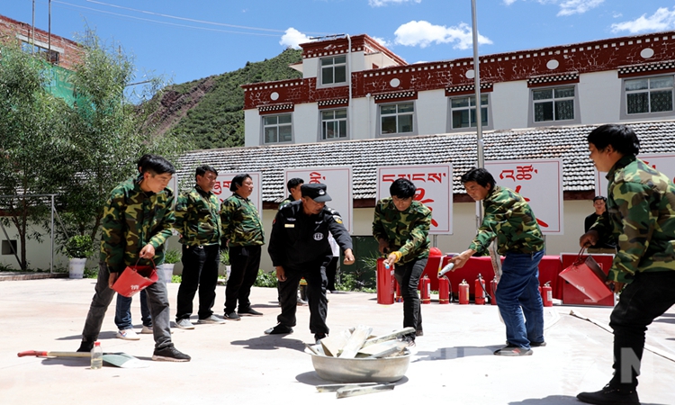 中國西藏網(wǎng)訊 “拔下保險(xiǎn)銷,讓噴嘴對(duì)準(zhǔn)火焰根部……”46歲的尼瑪一邊講解一邊演示滅火器使用方法和注意事項(xiàng),身邊幾位穿著迷彩服的學(xué)員正認(rèn)真觀察并模仿著。