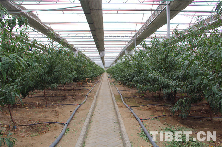 在高原上栽好一棵桃樹需要傾注更多的心血。經(jīng)過大棚的中控室,王榮華說:“這里晝夜溫差大、紫外線強(qiáng),冬天的時(shí)候還要澆凍水、拉膜蓋土、給樹打防凍液,在高原發(fā)展果樹種植困難不少。不同于內(nèi)地的桃樹,在這里快4年了,露天的桃樹只長高兩三米?!闭f到這里,他不由感慨科技種植的力量:“大棚里的桃樹一年就長到3米多高,并且掛果了。回想2017年時(shí),露天種下的桃樹只有手指粗細(xì),如今長勢這么好,真有點(diǎn)不可思議?!?/p>