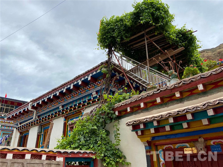 與同行者贊嘆一番,我的目光緩緩下移。在葡萄架側(cè)下方的房頂上,擺放著一排花盆。眾人皆知藏族愛(ài)花,即使在冬季,居民也會(huì)在陽(yáng)臺(tái)養(yǎng)著幾盆花。如今進(jìn)入雨季,主人把一盆盆花兒搬上房頂,與遠(yuǎn)方的朋友共享好時(shí)光。