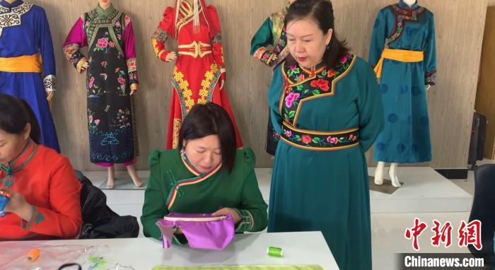 圖為田斯琴高娃正在指導(dǎo)蒙繡技藝?!醅?攝