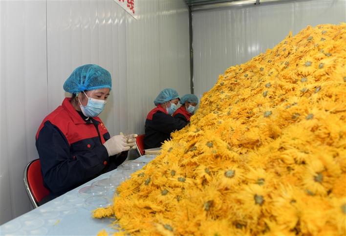 圖為經(jīng)過培訓(xùn)的崗巴縣崗巴鎮(zhèn)群眾在金絲皇貢菊種植基地內(nèi)工作。記者 潘多 唐斌 攝