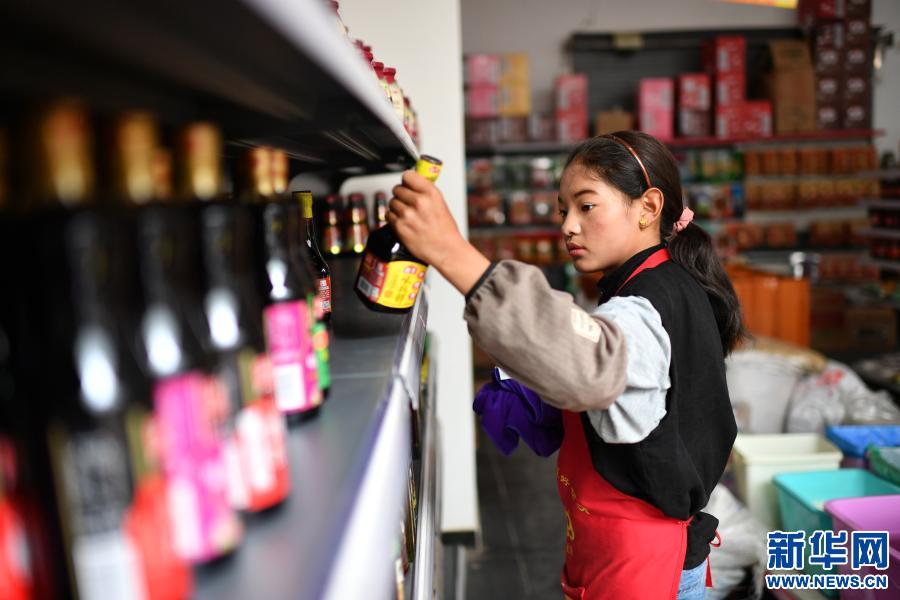 西藏昌都市丁青縣尺牘鎮(zhèn)烏巴村村民斯朗德吉在尺牘鎮(zhèn)的一家超市里打工(9月18日攝)。2018年,斯朗德吉和家人從烏巴村搬遷到尺牘鎮(zhèn)易地扶貧搬遷安置點,住進了寬敞明亮的新房子。斯朗德吉還就近在安置點附近的超市找到了工作,每個月有2000元的收入。新華社記者 詹彥 攝