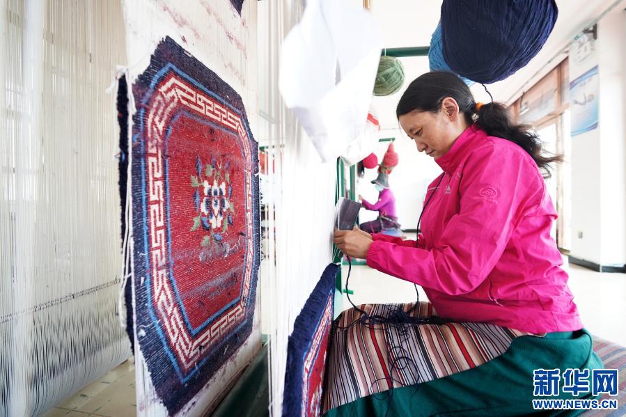 西藏阿里地區(qū)改則縣麻米鄉(xiāng)村民崗增在噶爾縣康樂新居服裝地毯加工廠里工作(7月25日攝)。2017年,崗增和家人搬遷到噶爾縣康樂新居易地扶貧搬遷安置點,住進了125平方米的新居。崗增還就近在安置點的服裝地毯加工廠找到了工作,每個月有3000元左右的收入。新華社記者 詹彥 攝