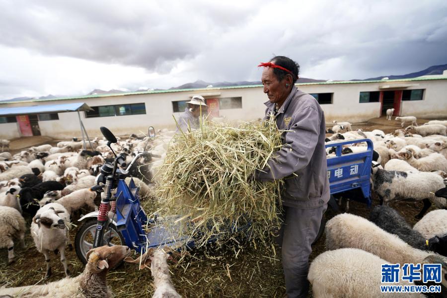 西藏日喀則市定日縣克瑪鄉(xiāng)幫布村村民頓珠在定日縣珠穆朗瑪崗巴羊規(guī)模化養(yǎng)殖產(chǎn)業(yè)園喂羊(7月31日攝)。頓珠2020年來到產(chǎn)業(yè)園打工,負責喂羊、打掃羊舍,每個月有3500元的收入。新華社記者 詹彥 攝