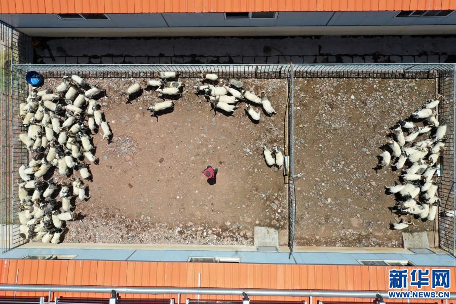 在西藏昌都市貢覺縣莫洛鎮(zhèn)阿旺綿羊繁育基地,阿果村村民色秋在查看綿羊的生長情況(5月2日攝,無人機照片)。2016年,色秋來到阿旺綿羊繁育基地打工,很快就學會了綿羊的養(yǎng)殖技術,現(xiàn)已成為繁育基地的一把好手,月工資漲到了4400元。新華社記者 詹彥 攝
