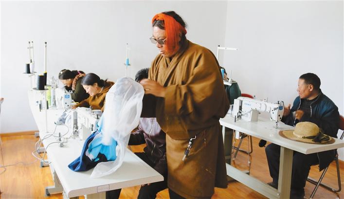 圖為在巴青縣扶貧服裝加工廠,拉加(右一)和工人們正在縫制衣服。記者 萬靖 攝