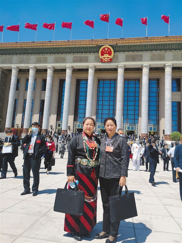 圖為貢覺曲珍(左)在會場外與西藏參會委員合影留念。(圖片由貢覺曲珍提供)