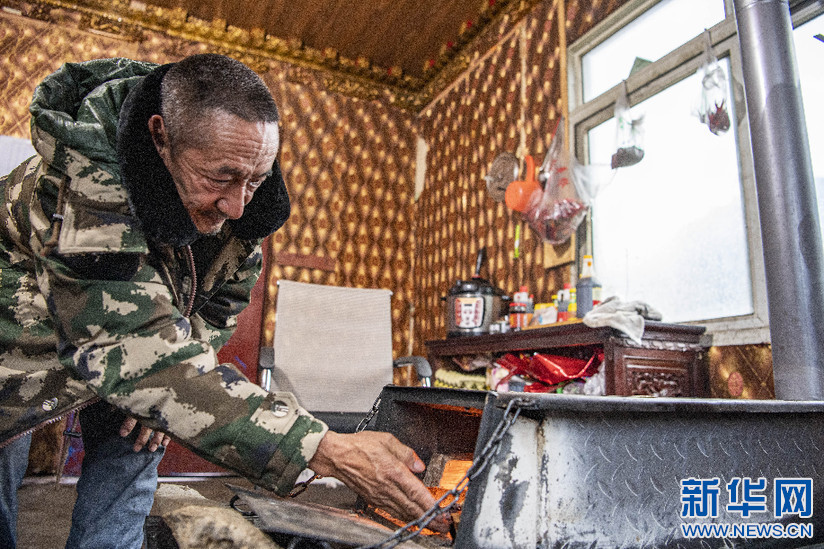 在易貢鄉(xiāng)通加村擔任村黨支部書記的索朗次仁給爐子生火(4月1日攝)。新華社記者 孫非 攝