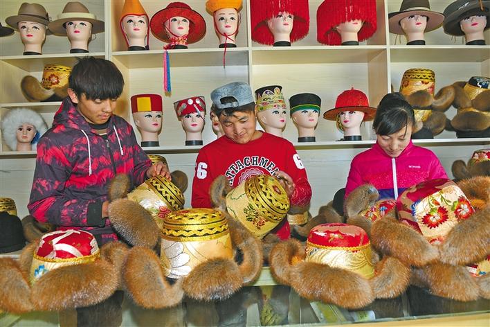 貢嘎縣朗杰藏帽合作社的員工在銷售藏帽。
