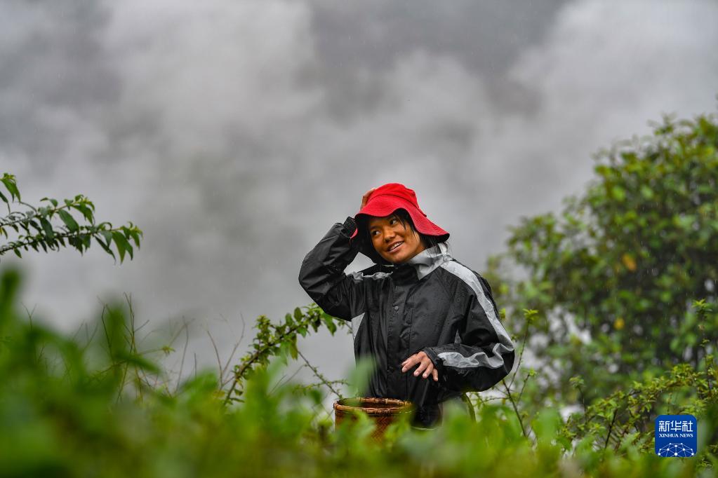 貢桑拉姆在自家的茶田里采摘茶青(4月16日攝)。