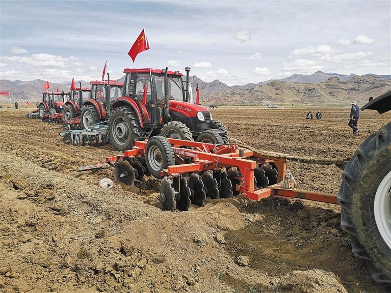 圖為林周縣曲嘎強村村民用農(nóng)用機械平整土地種植燕麥飼草。楊先亮 攝記者 李成業(yè)