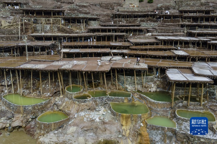 加達(dá)村村民在古鹽田里勞作(無人機(jī)照片,5月26日攝)。新華社記者 周荻瀟 攝