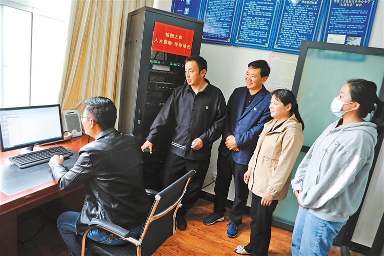 圖為墨竹工卡縣人大常委會黨組書記、主任張志文(左三)和人大代表一起回訪,了解尼瑪江熱鄉(xiāng)中心小學(xué)更換的廣播系統(tǒng)使用情況。記者 格桑倫珠 裴聰 攝