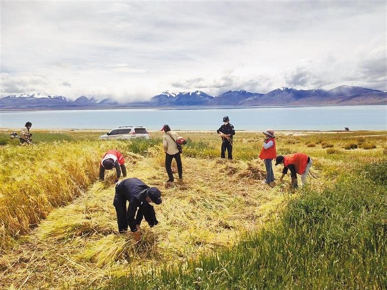 近日,日喀則市康馬縣公安局在統(tǒng)籌安排好工作的同時(shí),組織民輔警志愿者深入南尼鄉(xiāng)楚嘎村田間地頭,幫助缺勞力家庭開展秋收。在豐收的田野上,民輔警志愿者分工明確,有的用背負(fù)式收割機(jī)收割,留下一排排青稞茬;有的將成熟的青稞捆扎,堆積成一排排青稞垛子,進(jìn)行晾曬;有的忙于收集青稞穗,不浪費(fèi)一粒糧食。