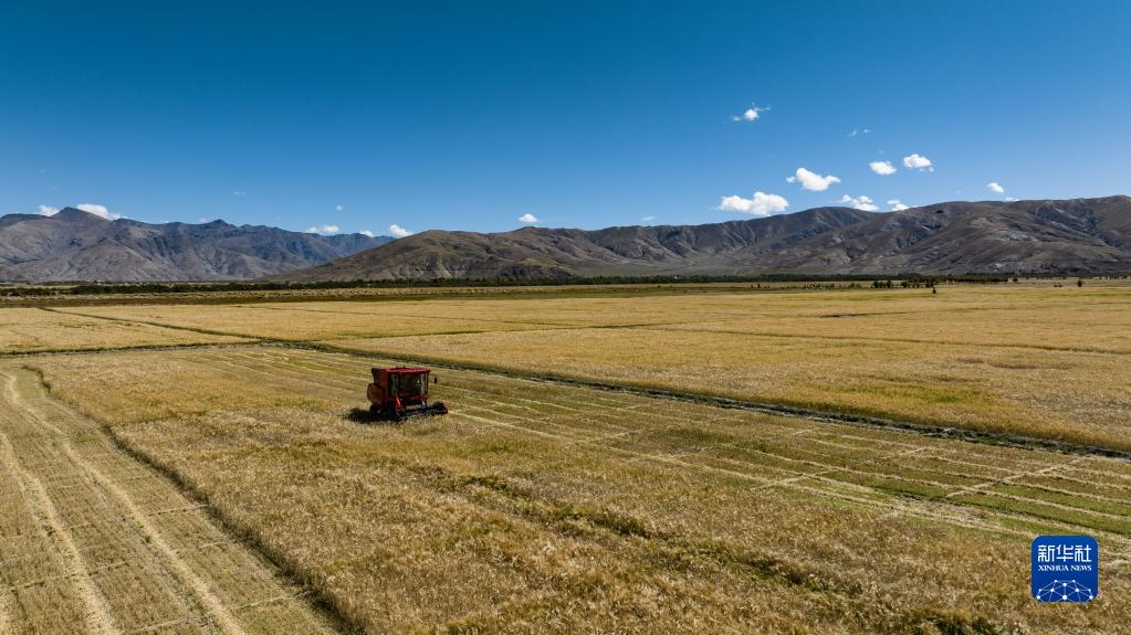 西藏日喀則市江孜縣熱索鄉(xiāng)努康村農(nóng)機(jī)合作社村民正在集中對(duì)村里三千多畝耕地進(jìn)行機(jī)械化收割(9月19日攝)。