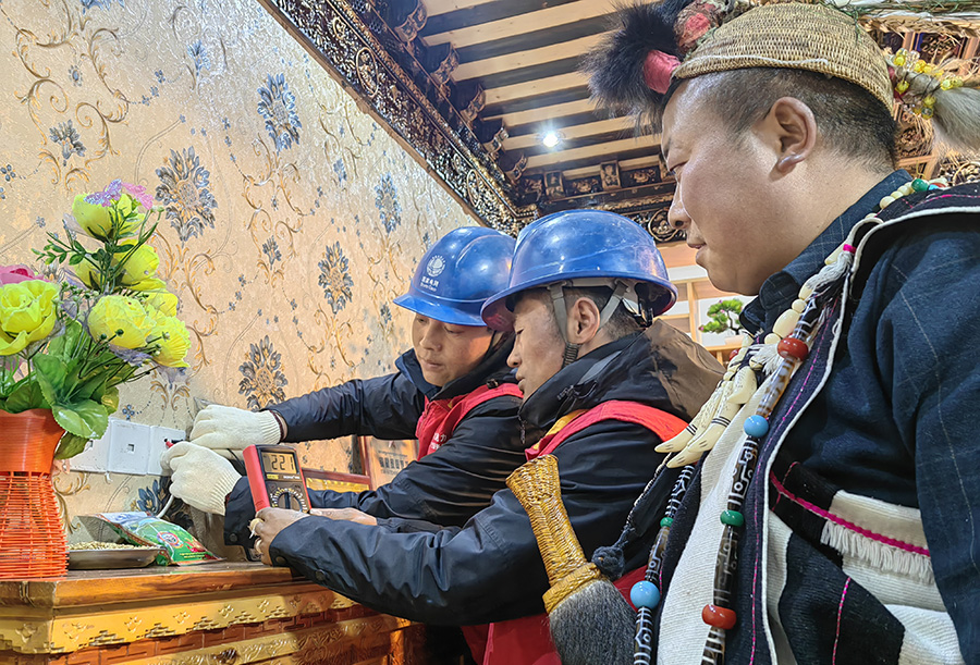 藏歷新年前,供電所服務(wù)班長(zhǎng)索朗吾珠、班員云丹正在檢查家庭旅館的電源開(kāi)關(guān)(2月19日攝)。國(guó)網(wǎng)西藏電力供圖 陶丹丹 攝