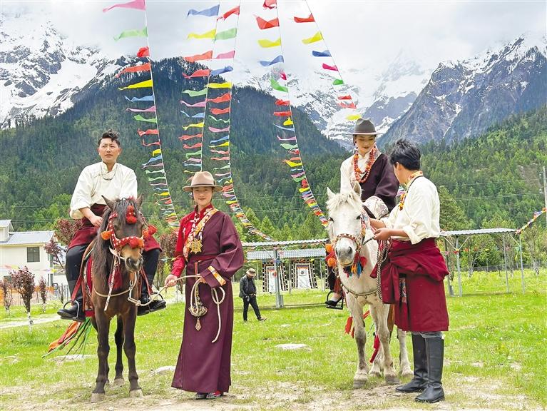 波密縣扎木鎮(zhèn)康木村坐落于318國道旁,風(fēng)景秀麗,群山環(huán)繞,很多自駕游的游客都會(huì)經(jīng)停于此體驗(yàn)藏家文化。 圖為游客在康木村,穿著藏裝體驗(yàn)騎馬樂趣。 圖片由本報(bào)記者 張猛 攝