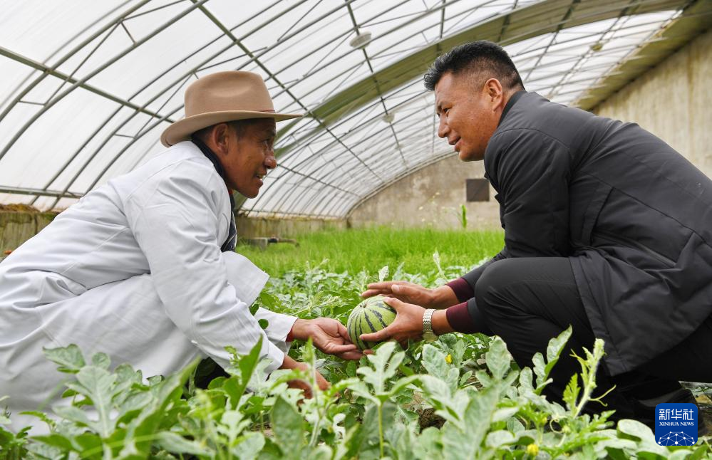 措勤縣農(nóng)牧業(yè)技術(shù)推廣站站長吾金次仁(右)和措勤縣高原生態(tài)畜牧業(yè)現(xiàn)代化養(yǎng)殖一體化產(chǎn)業(yè)綜合基地合作社負責人扎西桑布在西瓜大棚里交流(8月19日攝)。新華社記者 張汝鋒 攝
