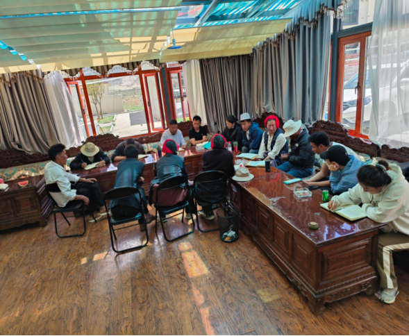 圖為駐村工作隊(duì)聽取村江多村獸藥物資需求會議現(xiàn)場。新華網(wǎng)發(fā) 舒啟航 攝