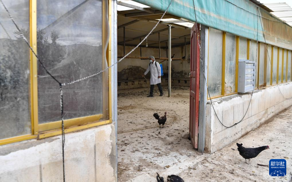 9月24日,合作社工作人員對(duì)雞舍進(jìn)行消毒。新華社記者 晉美多吉 攝