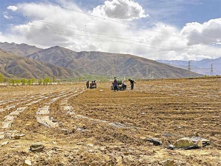 “這些土地,過去沙化太嚴(yán)重,無法保存水分,我們經(jīng)過不斷的翻耕改良后,才有了目前的這850畝土地?!蔽鞑厍睾剔r(nóng)業(yè)綜合開發(fā)有限公司工作人員洛珠達(dá)瓦介紹。