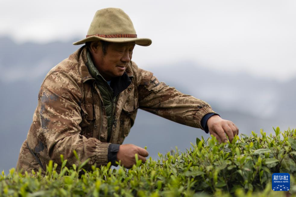 墨脫縣背崩鄉(xiāng)格林村的一位村民在茶園中采茶(4月24日攝)。新華社記者 姜帆 攝