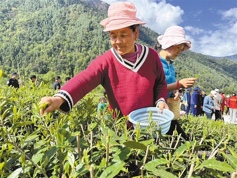 在墨脫縣格當(dāng)鄉(xiāng)德吉村,茶農(nóng)在采摘春茶。王凱 記者 王敏 攝