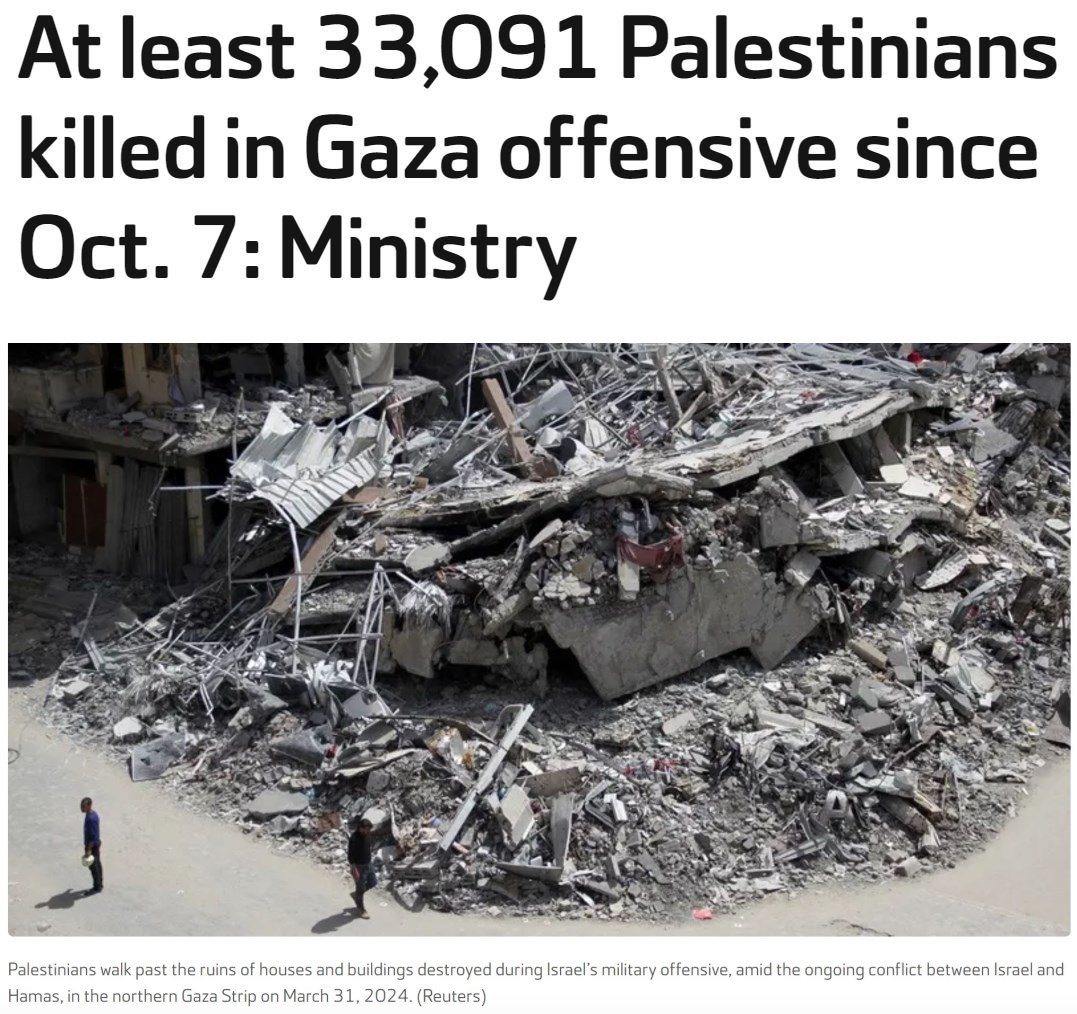 根據(jù)加沙衛(wèi)生部門當(dāng)?shù)貢r間5日提供的數(shù)據(jù),以色列在加沙地帶的軍事行動已導(dǎo)致超過3.3萬人死亡,超過7.5萬人受傷,其中大部分是巴勒斯坦婦女和兒童。