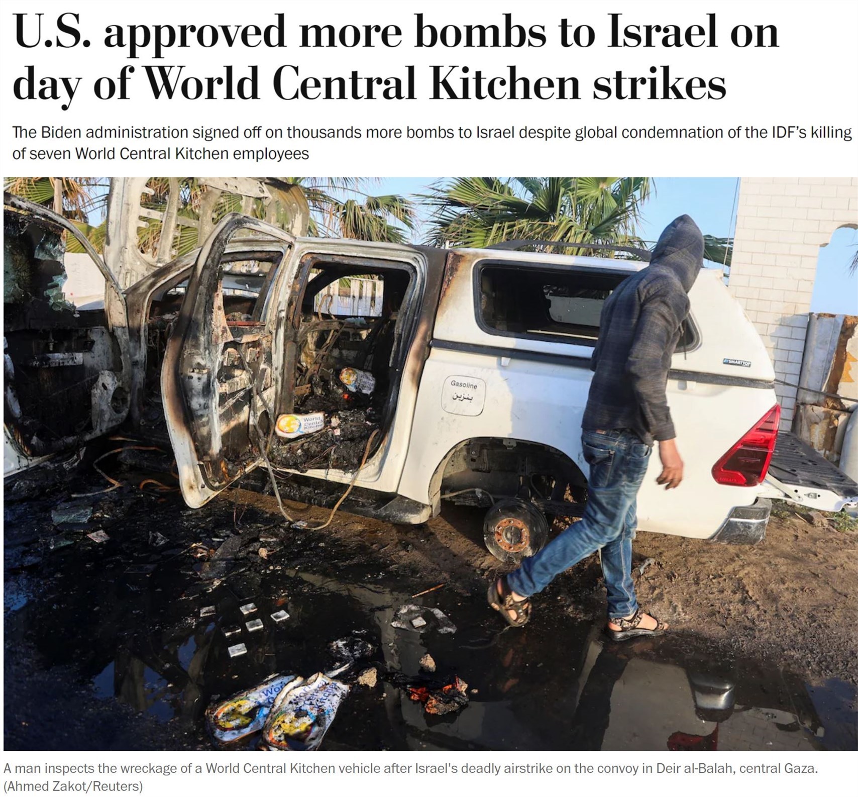 據(jù)美媒報道,就在以軍襲擊國際慈善組織的同一天,美國批準(zhǔn)再向以色列提供數(shù)千枚炸彈。