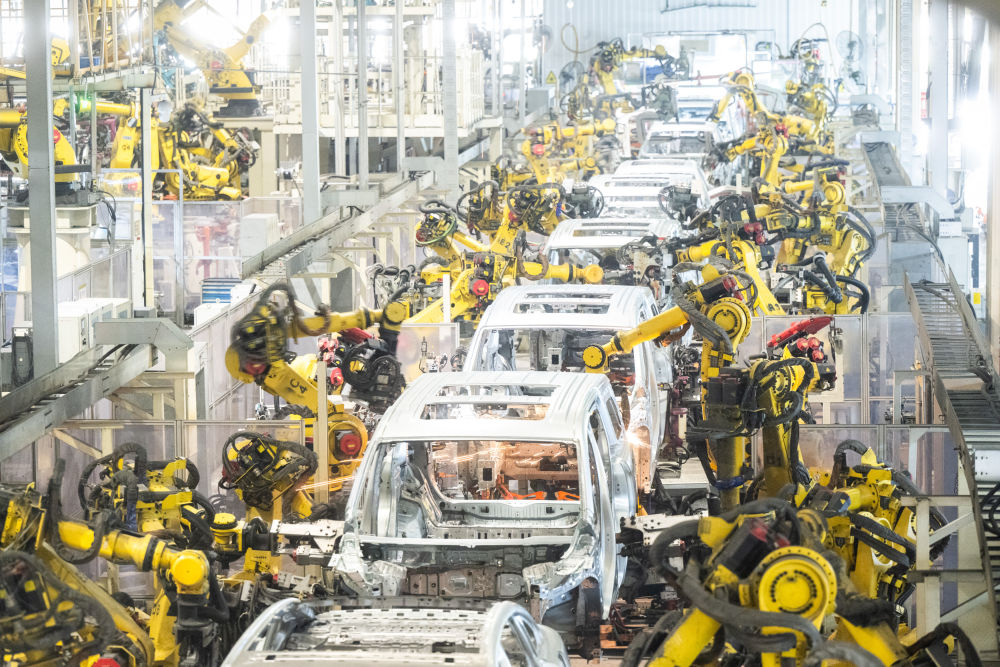 4月1日,在位于湖北武漢經(jīng)開區(qū)的嵐圖汽車電動化焊裝車間,機(jī)器人在流水線上作業(yè)。新華社記者肖藝九攝