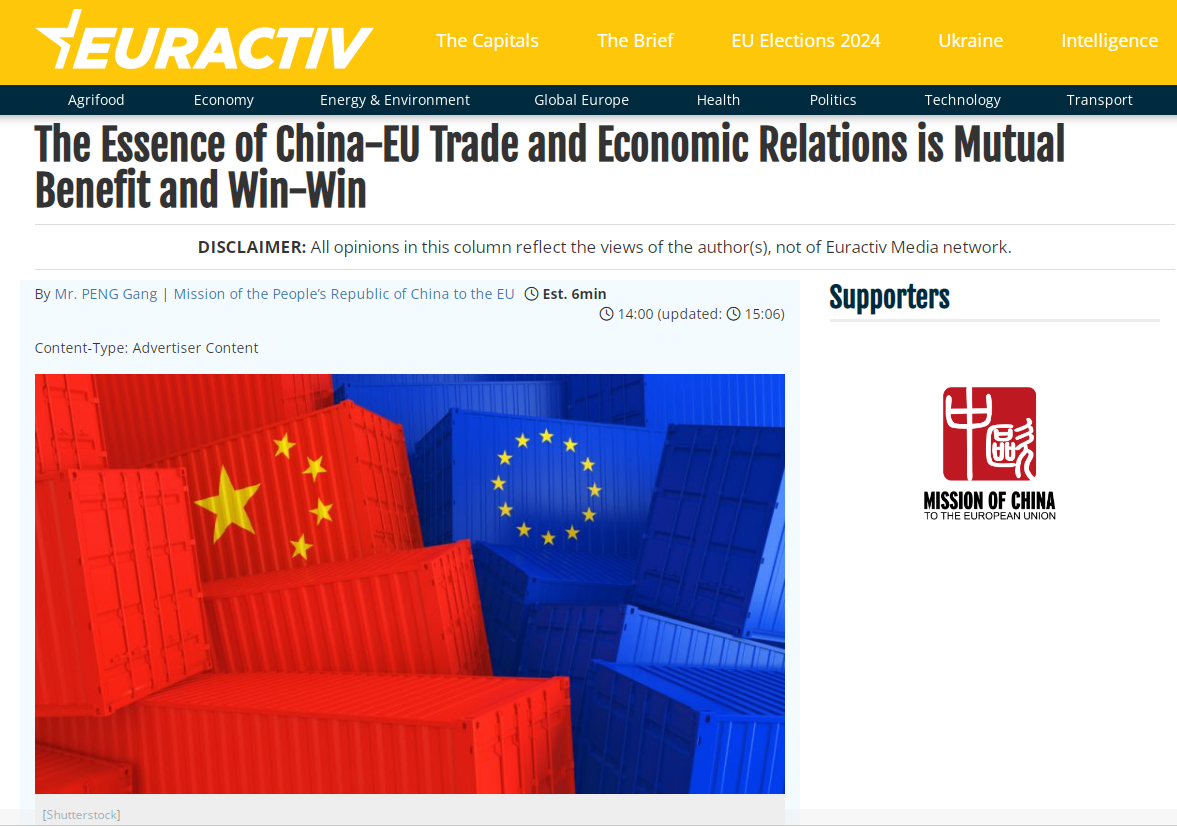 對(duì)此,中國(guó)駐歐盟使團(tuán)負(fù)責(zé)經(jīng)貿(mào)事務(wù)的公使彭剛在歐洲知名媒體“歐盟動(dòng)態(tài)”發(fā)表題為《中歐經(jīng)貿(mào)關(guān)系的本質(zhì)是互利共贏》的署名文章。文章強(qiáng)調(diào),“去風(fēng)險(xiǎn)”不應(yīng)成為“去機(jī)遇”。中國(guó)始終認(rèn)為中歐經(jīng)濟(jì)具有高度互補(bǔ)性,中國(guó)超大規(guī)模市場(chǎng)和歐洲4.5億人口的統(tǒng)一大市場(chǎng),是彼此經(jīng)濟(jì)發(fā)展的巨大機(jī)遇。當(dāng)前,“去風(fēng)險(xiǎn)”成為歐盟對(duì)華經(jīng)貿(mào)政策的重點(diǎn)。我們理解各方都有自己的關(guān)切,重要的是如何合理地界定和防范風(fēng)險(xiǎn)。中方反對(duì)將經(jīng)濟(jì)問(wèn)題政治化、意識(shí)形態(tài)化、泛安全化,使“去風(fēng)險(xiǎn)”變成“去機(jī)遇”和“去合作”。
