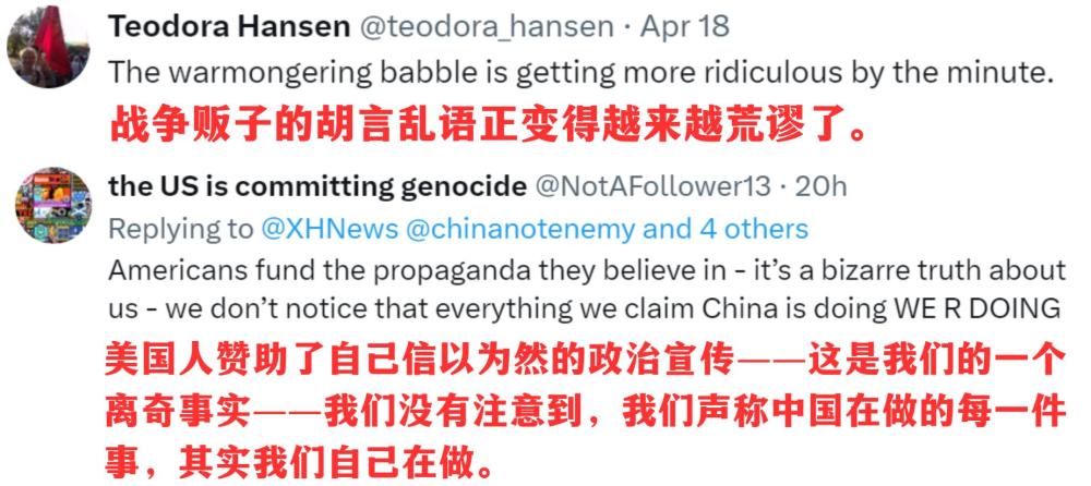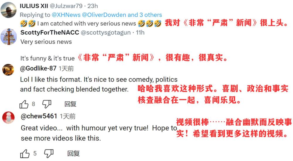 脫口秀播發(fā)后,英國議會(huì)議員喬治·加洛韋、倫敦廣播公司主持人丹尼絲·黑德利、倫敦都市大學(xué)副教授康斯坦丁諾斯·皮塔基、美國反戰(zhàn)組織“粉色代碼”等機(jī)構(gòu)和個(gè)人賬號紛紛轉(zhuǎn)贊評。網(wǎng)友們在評論區(qū)呼吁:這樣有趣又有料的節(jié)目,多多益善!