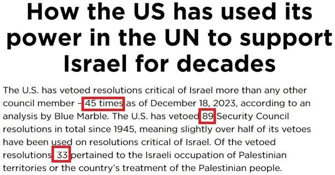 根據(jù)美國智庫"芝加哥全球事務(wù)委員會"的統(tǒng)計,截至2023年12月18日,美國否決批評以色列的安理會決議的次數(shù)比任何其他安理會成員國都多,為45次。自1945年以來,美國總共否決了89項(xiàng)安理會決議,這意味著,超半數(shù)的否決權(quán)被用于批評以色列的決議。而在被否決的決議中,有33項(xiàng)涉及以色列對巴勒斯坦領(lǐng)土的占領(lǐng)或巴勒斯坦人的待遇問題。