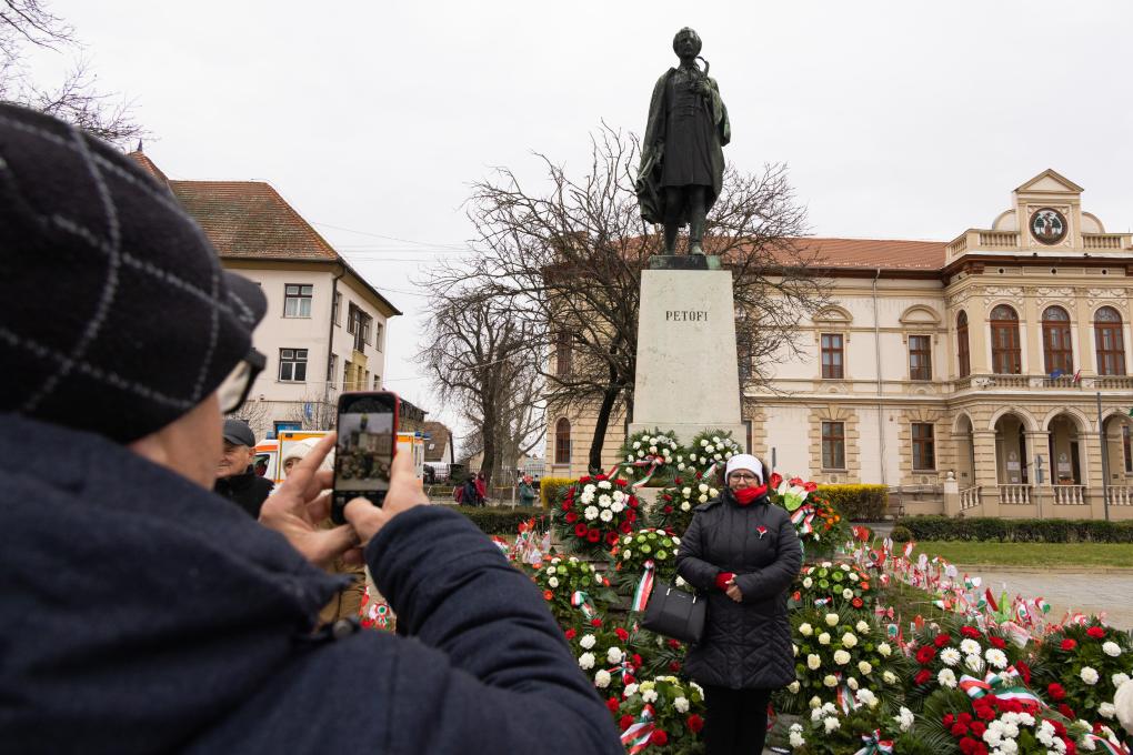 2023年3月15日,匈牙利首都布達(dá)佩斯和裴多菲出生地小克勒什舉行慶?;顒?dòng),紀(jì)念1848年革命和自由斗爭(zhēng)175周年。圖為民眾當(dāng)日在小克勒什的裴多菲雕像前拍照留念。新華社發(fā)(弗爾季·奧蒂洛攝)