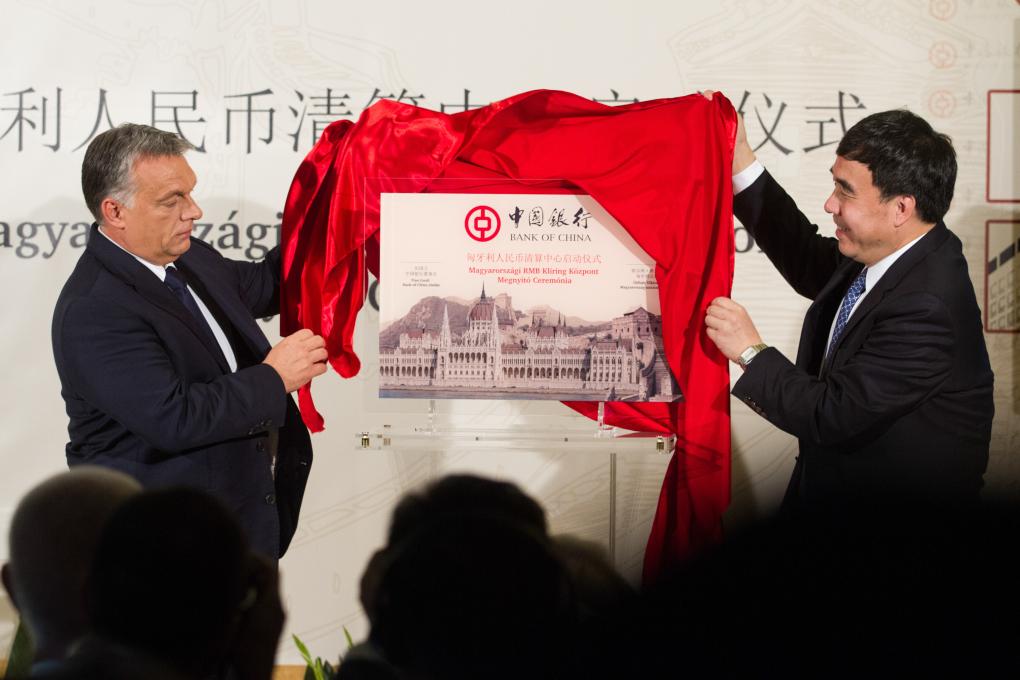 2015年10月2日,匈牙利總理歐爾班(左)在布達(dá)佩斯參加匈牙利人民幣清算行啟動(dòng)儀式。該行成為中東歐首家人民幣清算行。新華社發(fā)(弗爾季·奧蒂洛攝)
