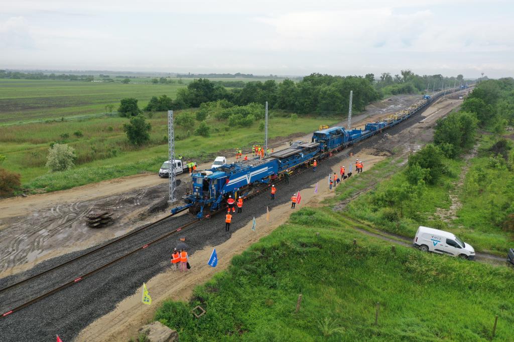 2023年5月30日,匈塞鐵路匈牙利段孔圣米克洛什-陶什站至伯斯特爾站區(qū)間首對(duì)鋼軌開(kāi)始鋪設(shè)。圖為當(dāng)天孔圣米克洛什-陶什站施工現(xiàn)場(chǎng)(無(wú)人機(jī)照片)。新華社發(fā)(中國(guó)中鐵匈塞鐵路項(xiàng)目經(jīng)理部供圖)