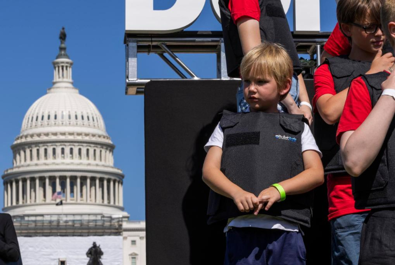2022年6月6日,學(xué)生們身穿防彈衣在美國華盛頓的國會大廈前參加名為“不要回避”的抗議活動,呼吁立法機(jī)構(gòu)正視美國槍擊案頻發(fā)的社會問題,要求加強(qiáng)槍支管控立法。新華社發(fā)(亞倫攝)