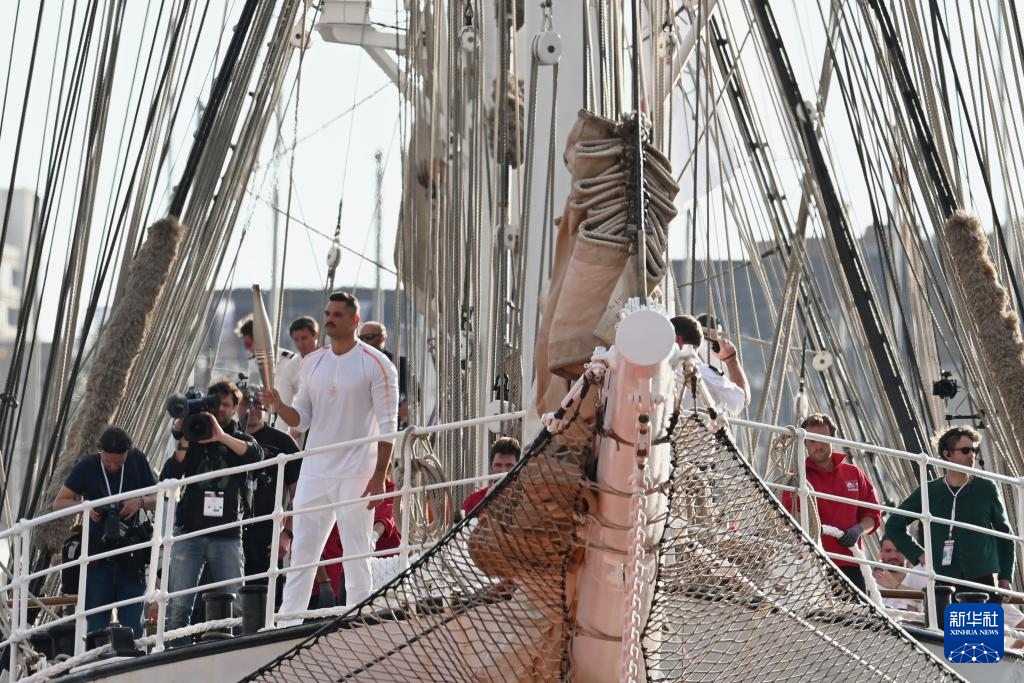 ??在“貝勒姆”號(hào)靠岸后,馬賽交響樂團(tuán)開始演奏巴黎奧運(yùn)會(huì)主題曲《巡游盛典》。約19時(shí)30分,2012年倫敦奧運(yùn)會(huì)游泳冠軍弗洛朗·馬諾杜作為在法國本土的第一棒火炬手,手持火炬從“貝勒姆”號(hào)上走下,象征著奧運(yùn)火種正式登陸法國。