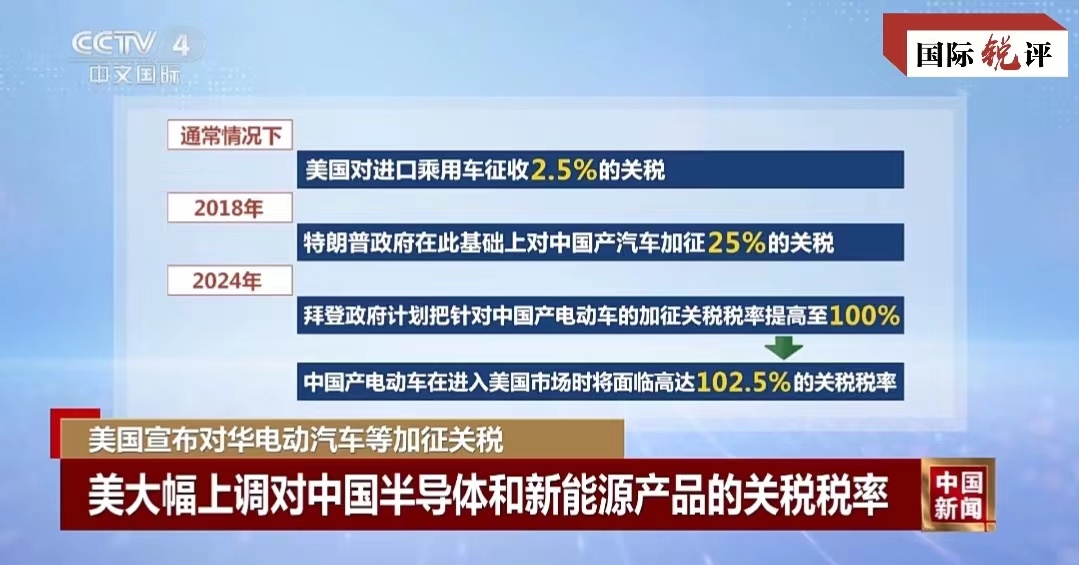2018年3月,美國時任特朗普政府依據(jù)所謂“301調(diào)查”挑起對華貿(mào)易戰(zhàn),先后對約3600億美元中國輸美商品加征高額關稅。2022年5月,在四年期對華加征關稅行動到期前,拜登政府宣布啟動相關復審程序。當?shù)貢r間14日,美方發(fā)布了復審結果,宣布進一步提高對華關稅,涉及商品包括以電動汽車、鋰電池、光伏產(chǎn)品為代表的中國“新三樣”,以及關鍵礦產(chǎn)、半導體、鋼鋁、港口起重機、個人防護裝備等。