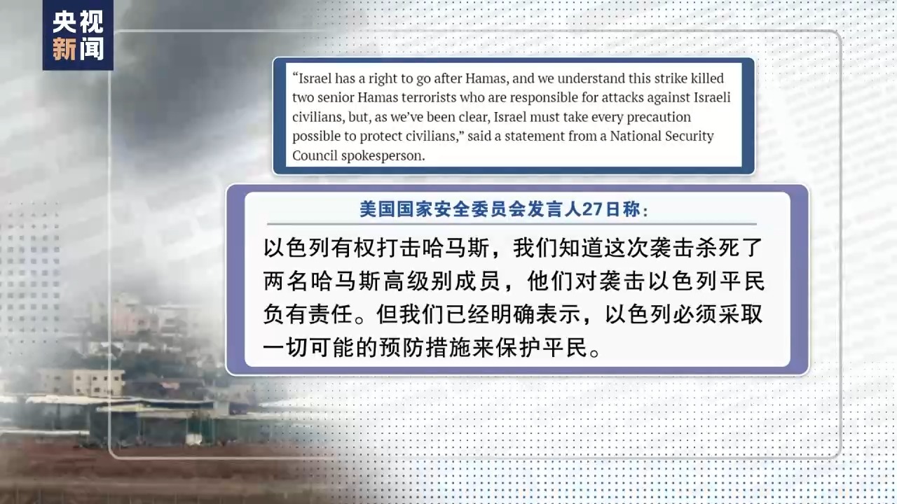 美國國家安全委員會發(fā)言人27日稱:以色列有權打擊哈馬斯,我們知道這次襲擊殺死了兩名哈馬斯高級別成員,他們對襲擊以色列平民負有責任。但我們已經明確表示,以色列必須采取一切可能的預防措施來保護平民。