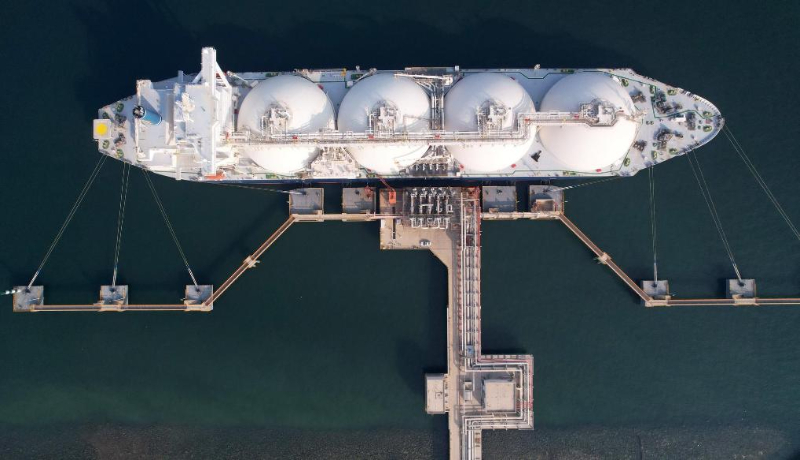 2022年10月21日,一艘液化天然氣運(yùn)輸船靠泊在中國(guó)石化天津LNG接收站“1號(hào)泊位”進(jìn)行卸船作業(yè)(無(wú)人機(jī)照片)。新華社記者趙子碩攝