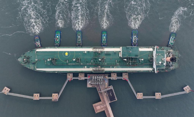 2023年11月15日,來(lái)自卡塔爾的“阿爾達(dá)夫那”號(hào)LNG輪在拖輪的協(xié)助下向唐山港曹妃甸港區(qū)中國(guó)石油唐山LNG接收站碼頭靠泊(無(wú)人機(jī)照片)。新華社記者楊世堯攝