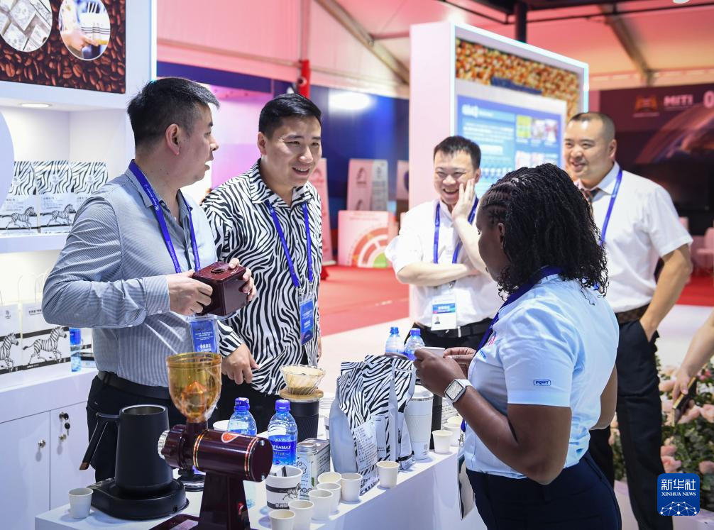 2024年5月9日,參展商在肯尼亞首都內(nèi)羅畢舉辦的中非經(jīng)貿(mào)博覽會(huì)走進(jìn)非洲巡展上推銷(xiāo)咖啡產(chǎn)品。新華社記者 李亞輝 攝