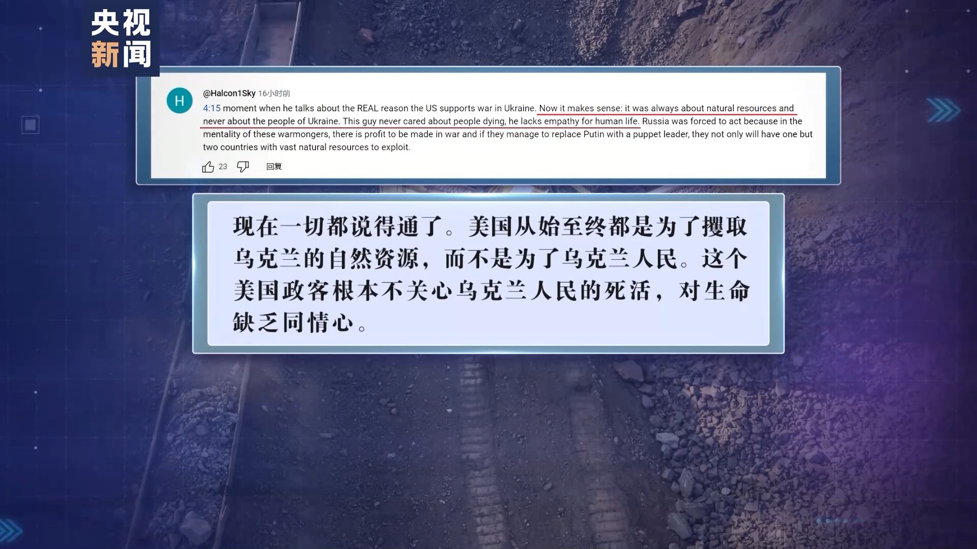網(wǎng)友:現(xiàn)在一切都說(shuō)得通了。美國(guó)從始至終都是為了攫取烏克蘭的自然資源,而不是為了烏克蘭人民。這個(gè)美國(guó)政客根本不關(guān)心烏克蘭人民的死活,對(duì)生命缺乏同情心。