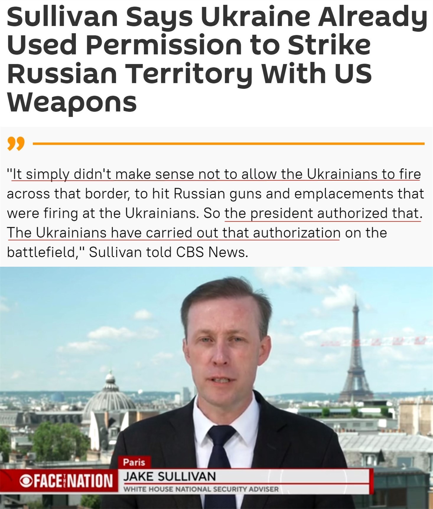 △俄羅斯衛(wèi)星通訊社:美國總統(tǒng)國家安全事務(wù)助理沙利文9日在接受美媒采訪時證實,烏軍已經(jīng)使用美國提供的武器打擊俄羅斯本土目標(biāo)。