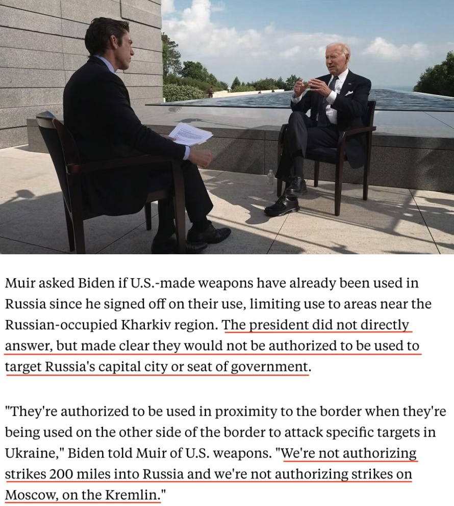“它們(這些武器)被授權(quán)在(烏俄)邊境附近使用……我們沒有授權(quán)(烏克蘭)向俄羅斯境內(nèi)200英里(約合320公里)的地方發(fā)動襲擊,也沒有授權(quán)對莫斯科、克里姆林宮進(jìn)行打擊。”